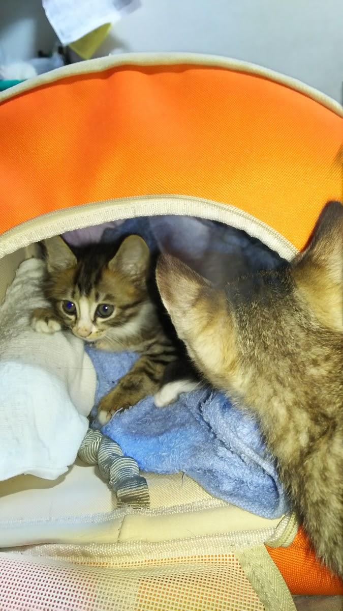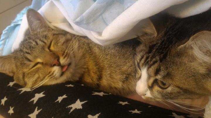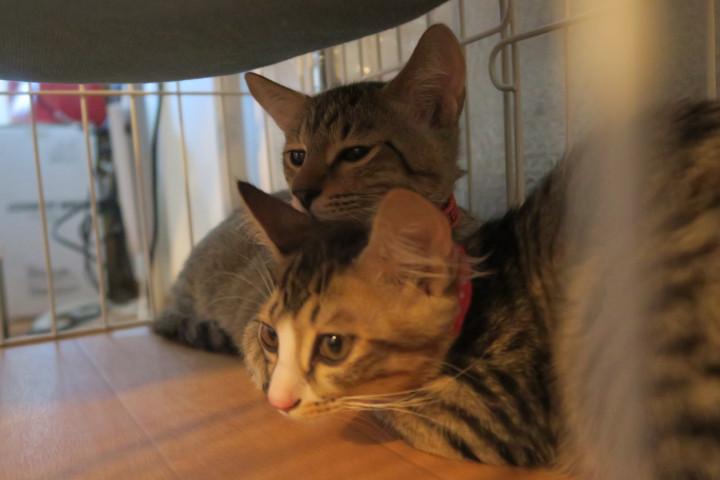 体調崩したサッシー😺と、心配して?覗き込むリオ😺