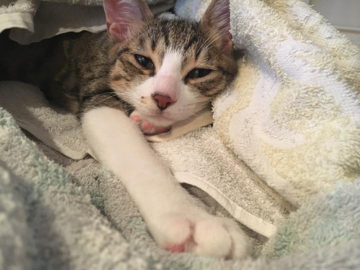 いれたてのほかほかな洗濯物にくるまって眠るミル