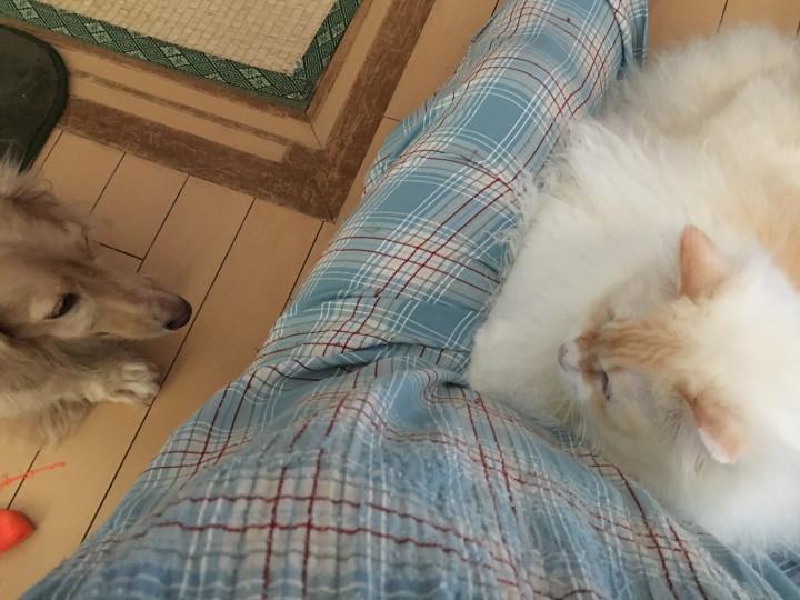 それにね、かあちゃんのお膝はボクの物だし、たけるには譲らないよ〜!