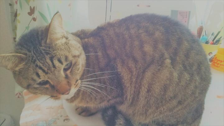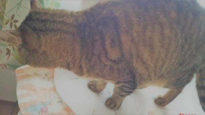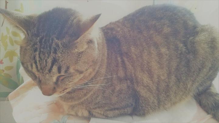 寒がりのきなこもちさんがキルト芯の上に乗りたくて狙っております。(肌寒い日でした)
