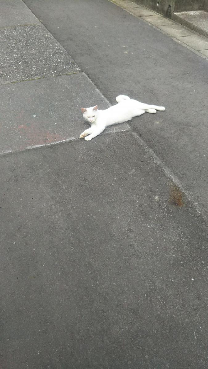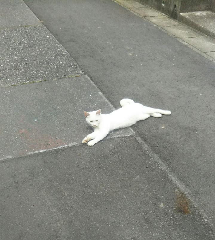 道路の真ん中で白猫が横たわっていました。もしかしたら、亡くなっちゃってる?ドキドキしながら、ゆっくり近寄ってみました。