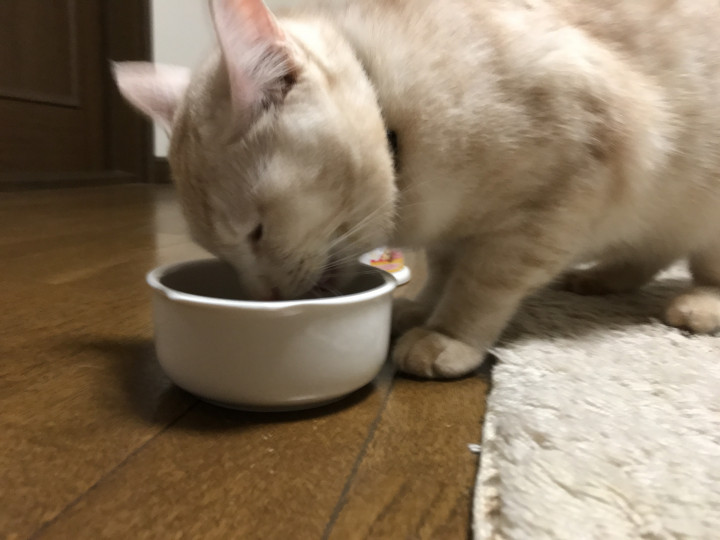 で、仕事から帰って来るとごはんの皿には残り3粒のみ。