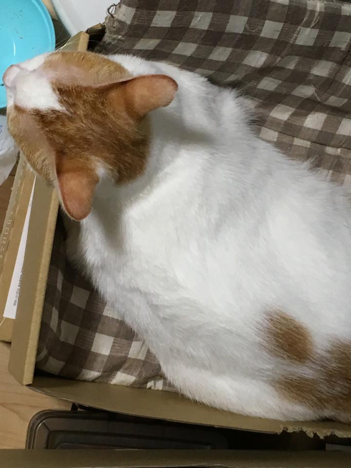 先住猫のタマ〔三毛猫メス2歳〕が大好きで、タマの後を追って来て、タマのお気に入りの場所を奪ってしまいます。これは、タマのお気に入りの箱に入って来て、箱を奪ったラムです。