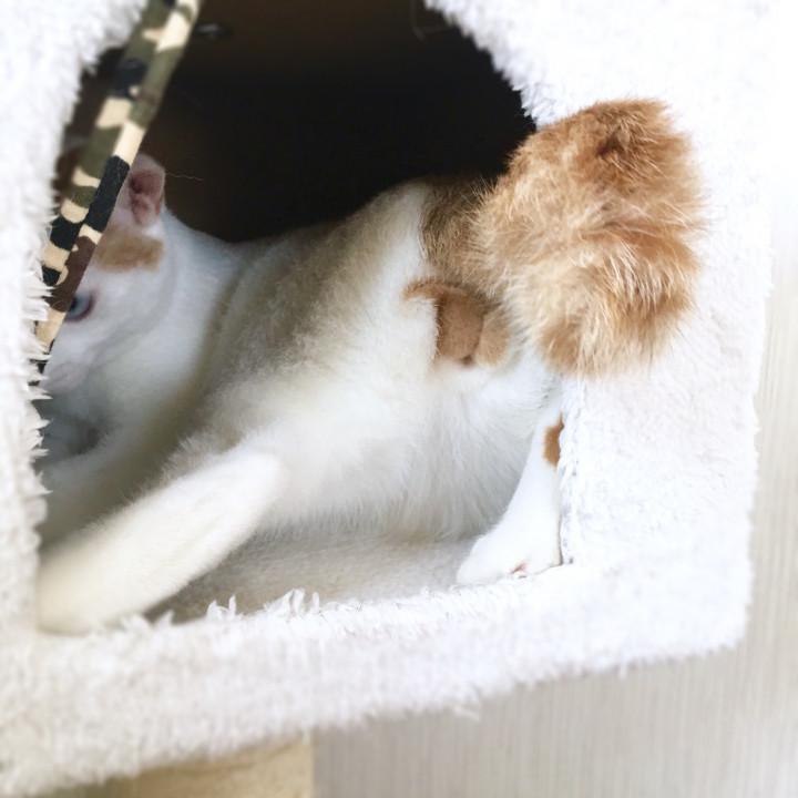 羽じゃらしに噛み付きながら