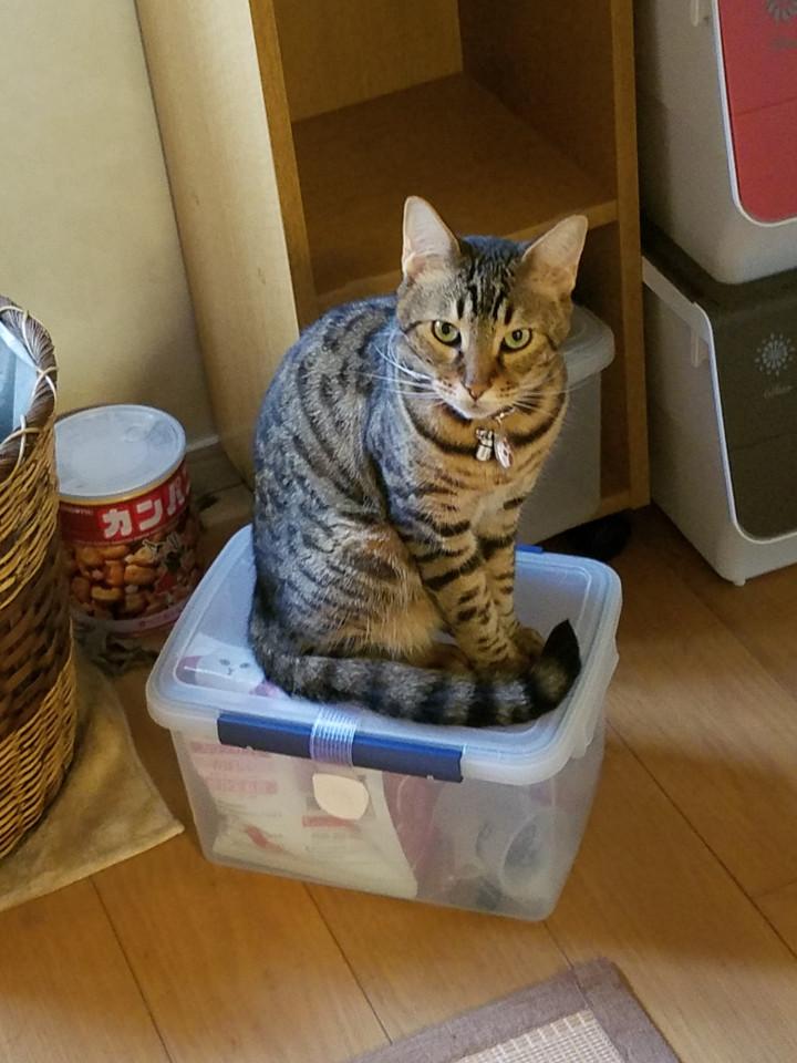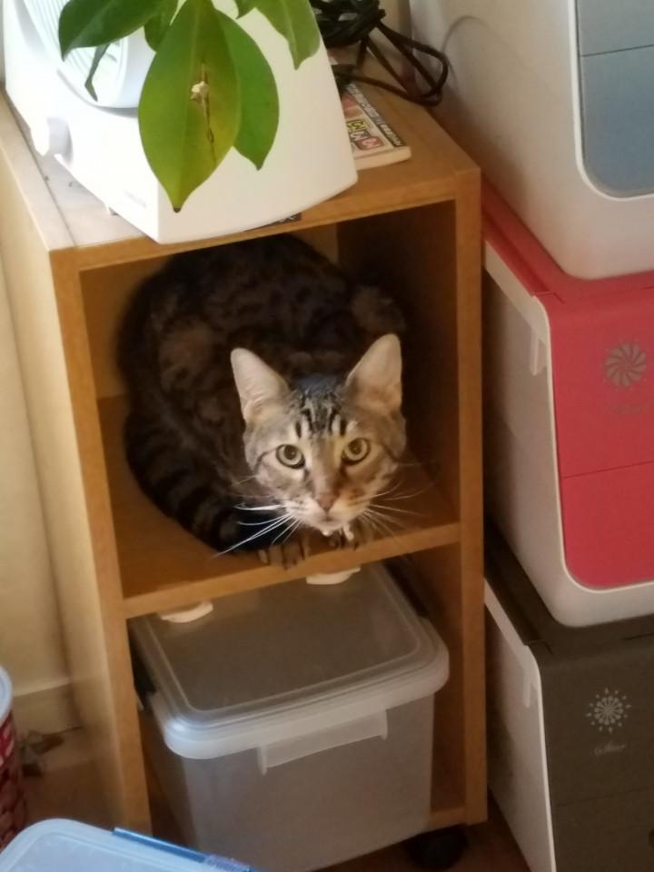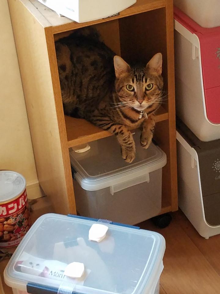 ゴハンのケースが入っていた棚に自ら入っていき、人間が前を通るのを待つようになりました😅