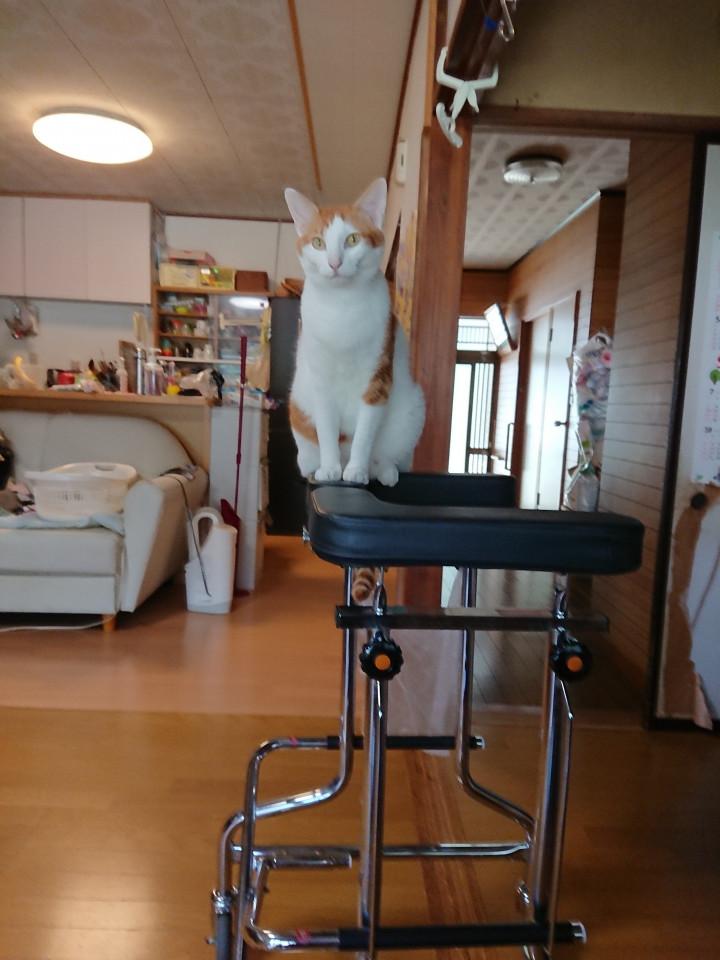 茶太郎がばあちゃんの歩行器に乗ってました。