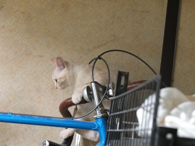 自転車に駆け上がり~一本橋を渡るチビコ。