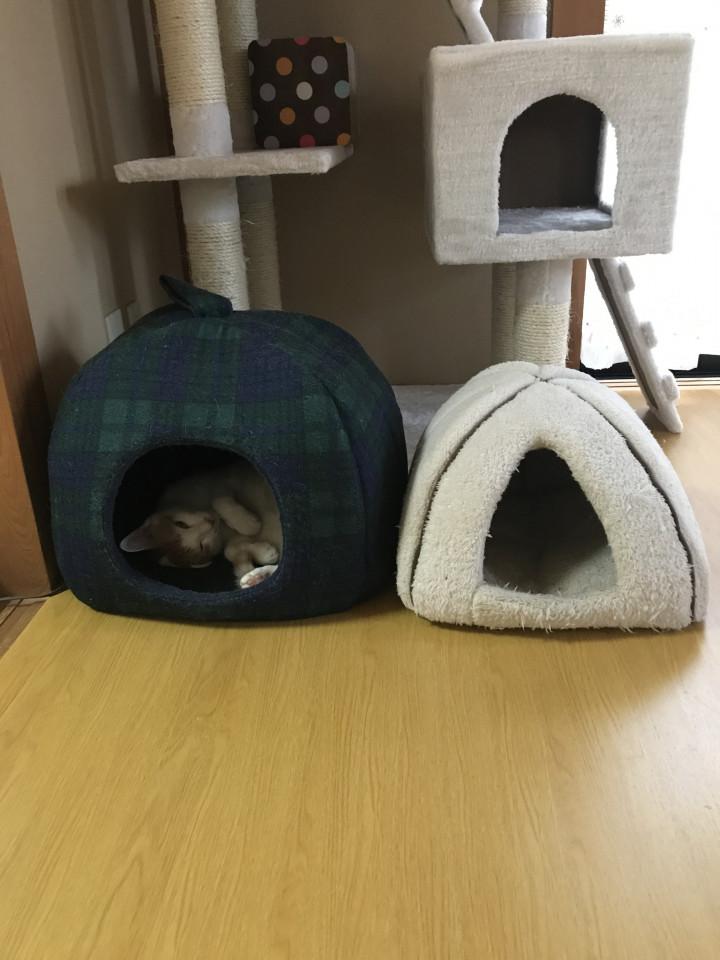 夏場は猫達も暑いので、玄関のたたきや、床でゴロンとしていましたが、肌寒くなって来たので、猫ベッドや猫ハウスを出しました。