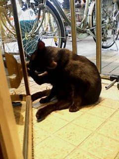 ここは商店街のコーヒーショップ前。店内を見ながら手を舐める猫いました。写した後はコーヒーを飲みました。