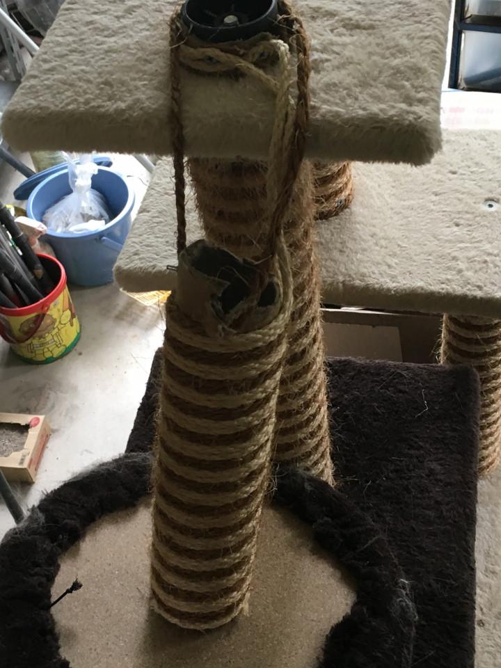 翌日、タワーの柱にビニールバイブを入れて、治しましたが、階段を使わず、爪を引っ掛けて登る活発な猫3匹なので、また、破壊されるかもしれないですね。