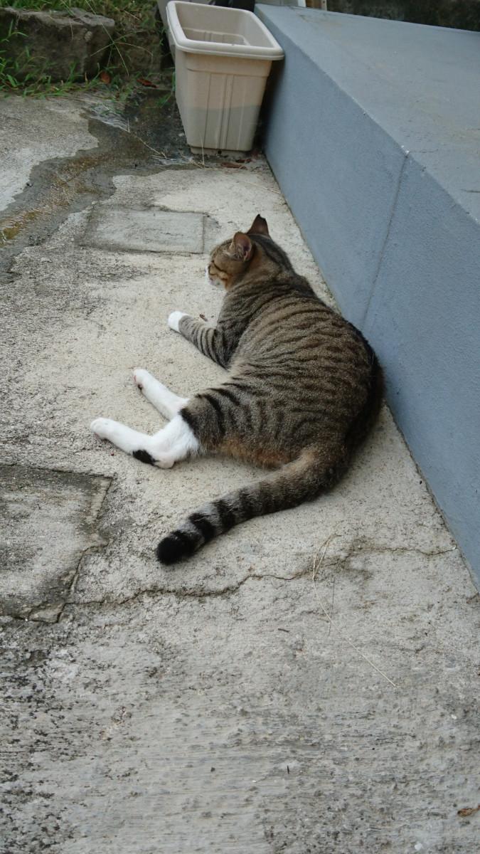 最近、朝ご飯を食べ終わっても猫さん達、お庭でゆっくりくつろいでいます。