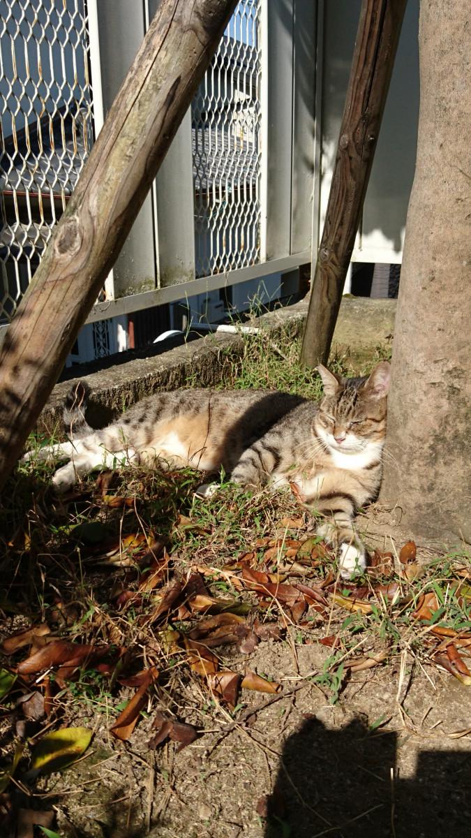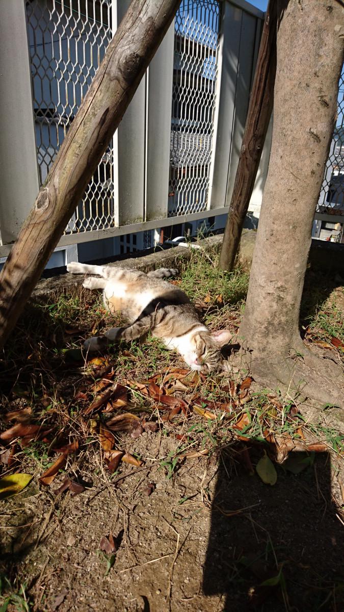 朝ご飯食べてお庭で日差し浴びながら寝る猫3号。