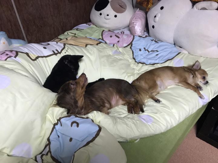 今日もみんな仲良くゴロゴロ。モコにゃんは冷蔵庫から見ていました。モコにゃんも混ざってみんなで寝てるところもみたいなー