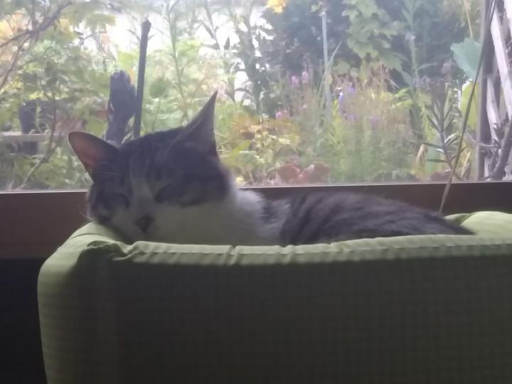 半覚醒の状態で、あー、ブッコ来たなぁ、起きなきゃなぁ、と思っていたら、ひょいとベッドに飛び乗り私の頭に顔を近づけてきた。