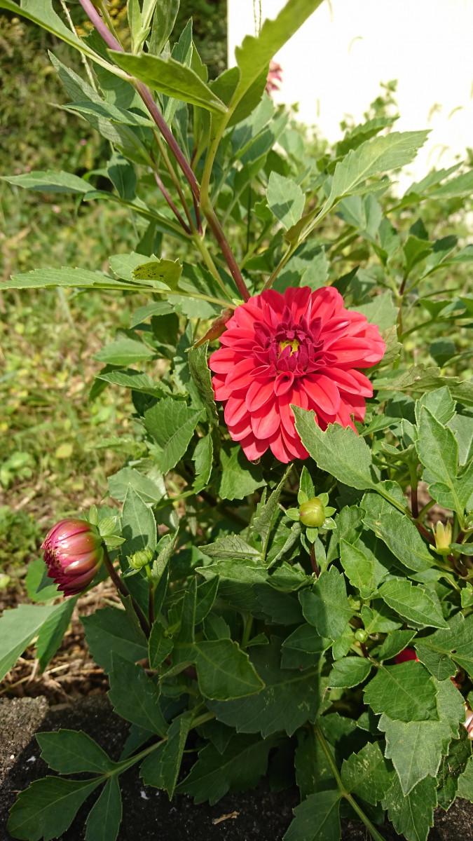 花壇から、真っ赤な太陽のようなダリアが咲いています。