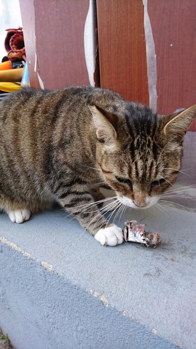 小鯵をあげるとき、猫1,2号はすぐにかぶりつきますが、3号は物凄くゆっくりで、1,2号が半分まで食べ進めているときにやっと食べ始めます。