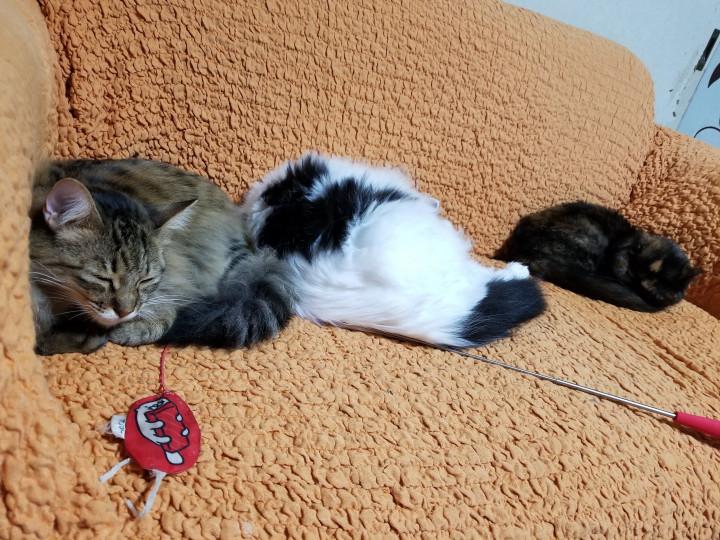 だんご状態で寝てた猫達もビックリして一斉に寝室から居なくなったけど~今は落ちついて寝てます。