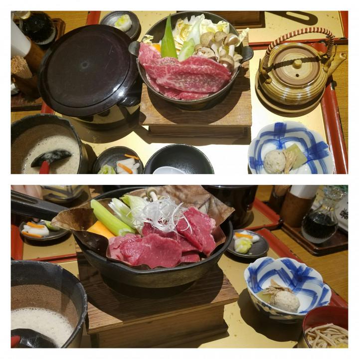 上はすき焼き、下は朴葉味噌焼きのセットです。