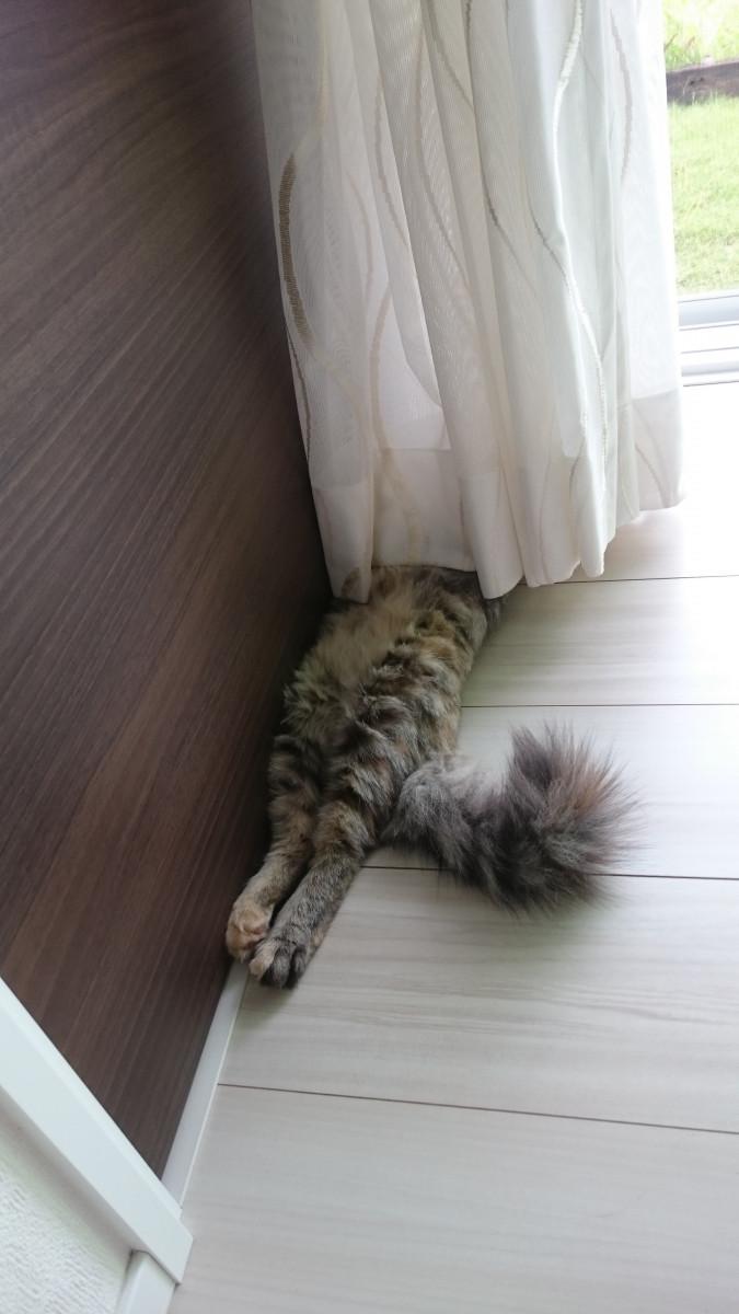 寝てるの!眩しくてカーテンに隠れたのかな?笑