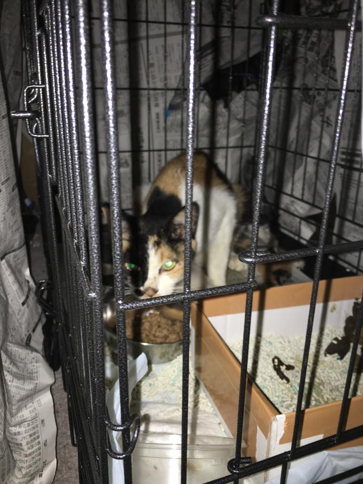 三毛ママ、しっかり世話を始めてくれ、仔猫が鳴きません。高栄養なフードを何回与えても即、完食。