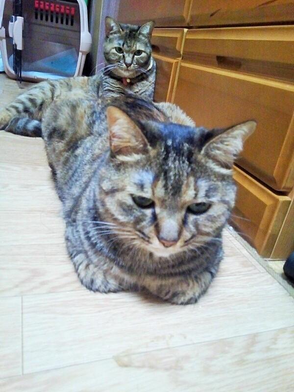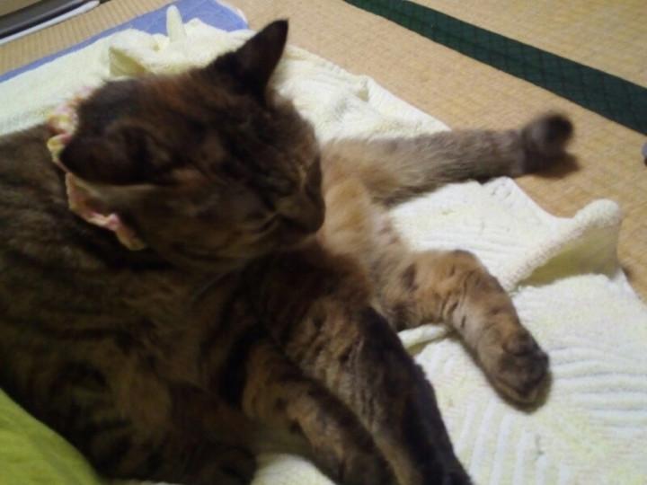 傍で既に一時間はやく餌貰った猫達も寝る。付き合いはいい様子。