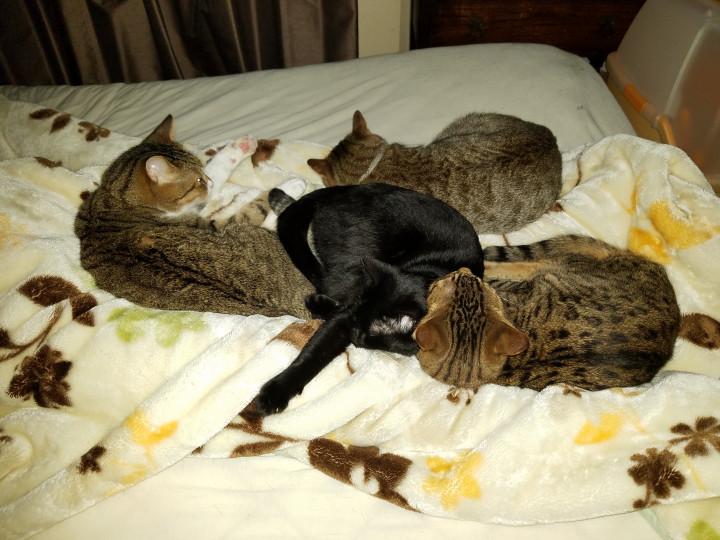 おとさんの足の間に、毛布の上から4🐱集合です。