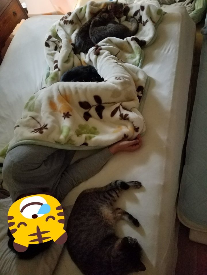 さすがにおとさんも寝返り打ったようですが、🐱ズはそのままおとさんと一緒に😪💤💤