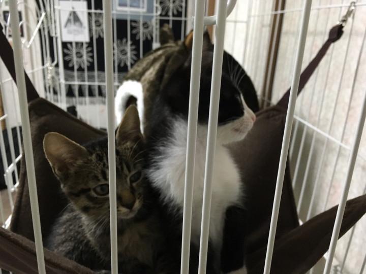 今回はキジトラ(仮名:トラ)まで…二匹ともお世話係が抱きかかえて降ろしました。