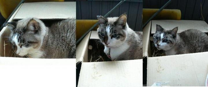 そのダンボールの中にはわらが入っており、以前は干し柿を保存していたのですが、先住猫だったみーの第二のお気に入りの場所でした。