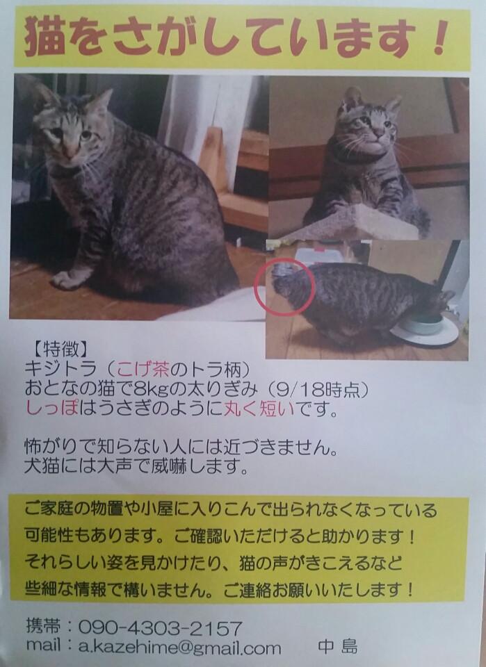 目撃された方は、もし可能であれば写真撮影していただき(無理なら写真なしで)、どうかご連絡をお願いいたします。