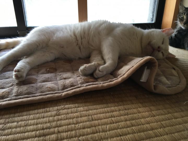 写真のシロさんは、2年前まで庭猫でしたので、猫小屋使ってました。