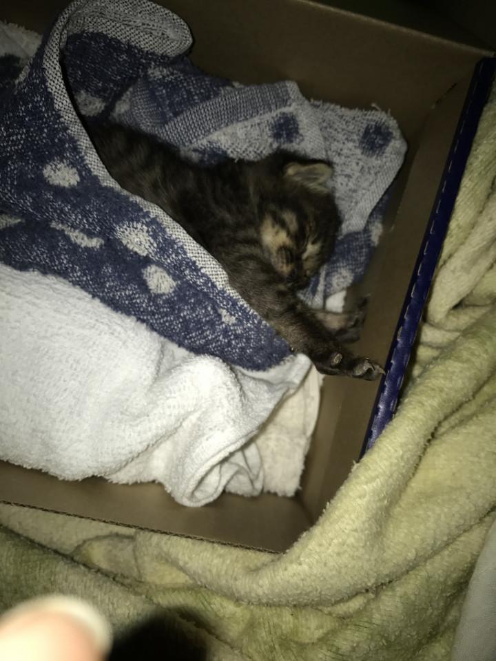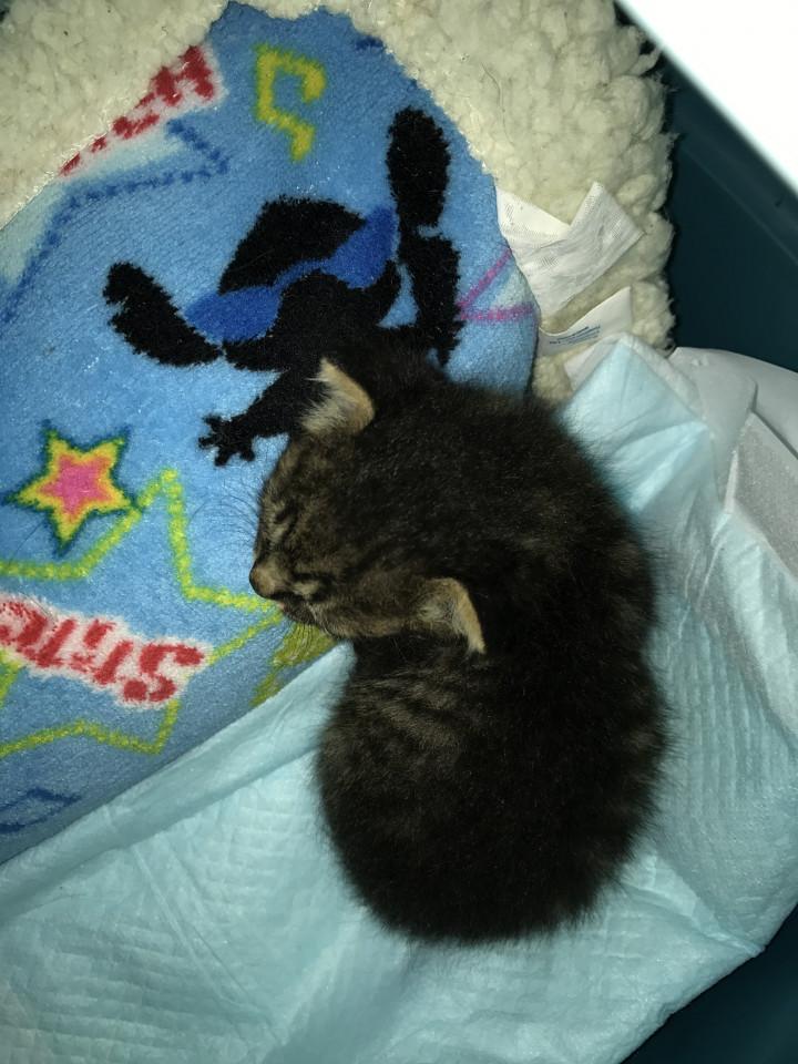 生後間もなく保護されて、ツテをたどって突然ウチにやって来た時は、ダンボールにタオル入れただけの中でプルプル震えていました、見たところ生後1週間も経っていないぐらいの子、お尻から2センチも直腸脱しているのを見た時、正直絶望し放心しましたが、すぐに覚醒して、脱した直腸を観察、深夜の為病院は開いてなくて、遠くの夜間診療してるところまでは、ど田舎ゆえに3時間はかかる、壊死も乾燥もしてない腫れても無い、色もいい、湿潤環境である、もう迷っている暇はない、暴れる子猫をガッチリホールドしてベビーオイルを使い指で押し込み、湯たんぽで温め、お尻を抑えながら、応急処置として、砂糖水と薄めたポカリ(低血糖と脱水対策をスポイトで殆どこぼされながら口にねじ込み、朝1番でかかりつけに飛び込みました、