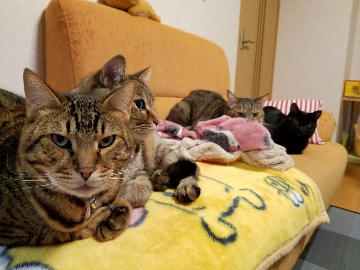 ニコの目付きが極悪だけど、珍しく4匹集合です。