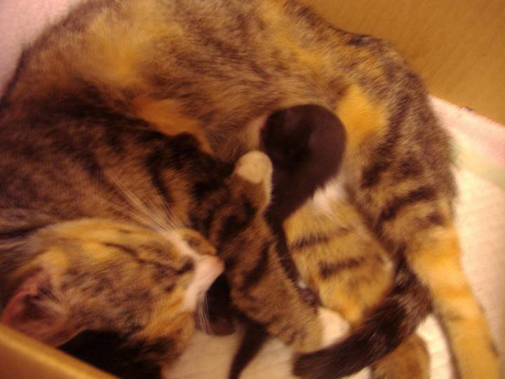 みーちゃんはお産後、早々におっぱいをあげたり、なめてあげたり、温めてあげるなど
