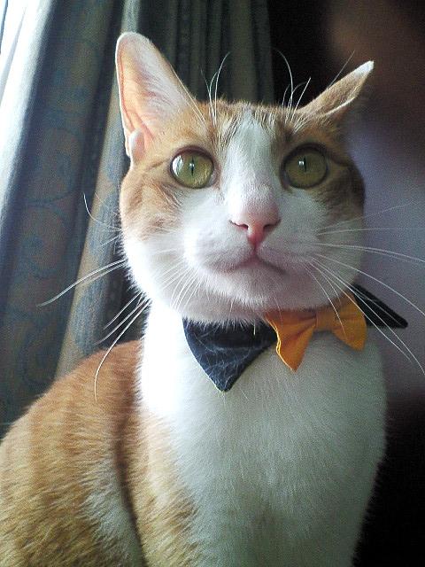 少し前の写真ですが私が作ってあげた蝶ネクタイ首輪をするロイ君です。