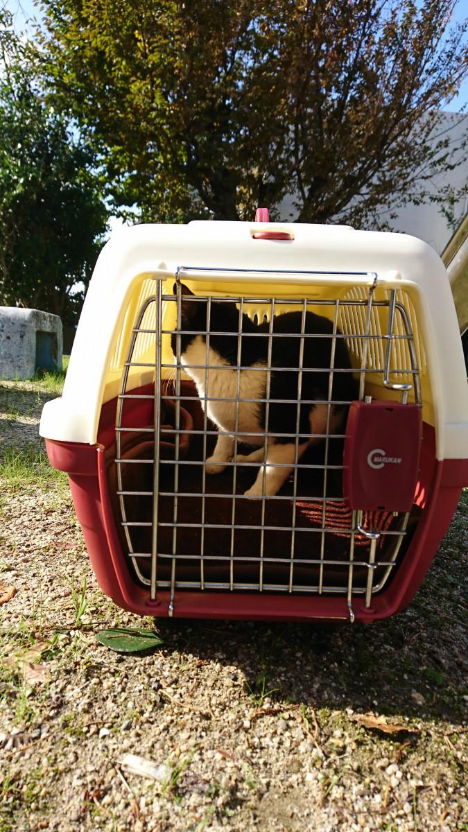 ハチワレ仔猫10号、キャリーの中で鳴きながらケース内をぐるぐる回っています。