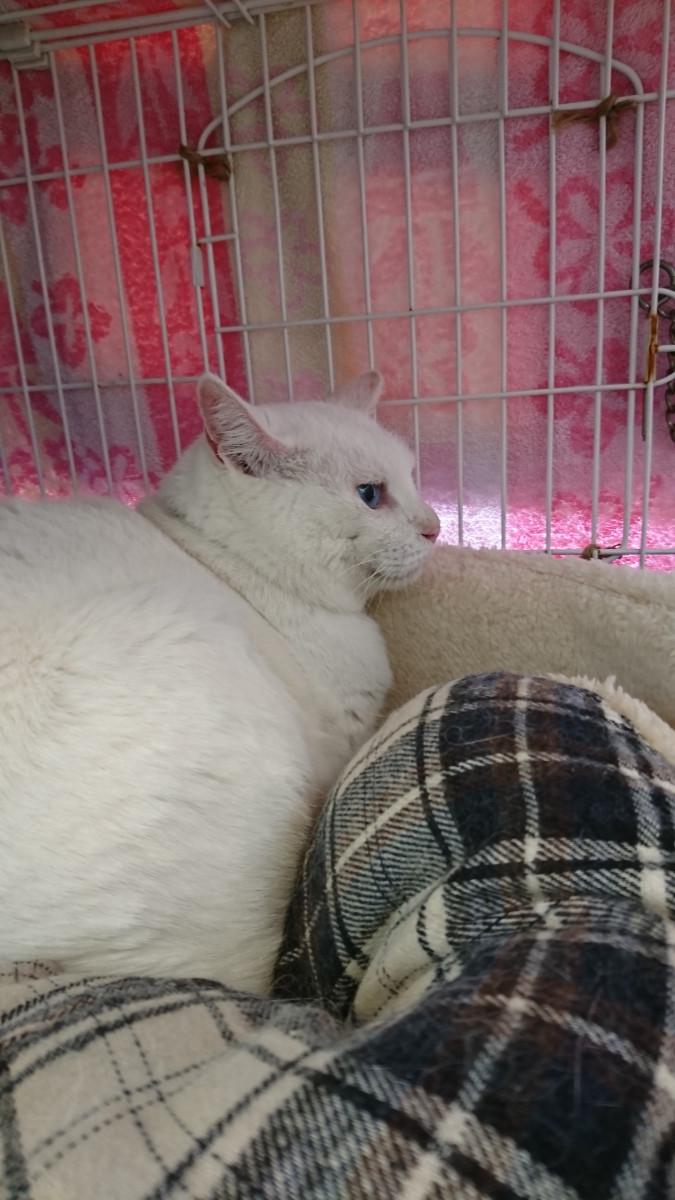 さて、シロちゃんはというと、譲渡会場までの車移動中〜ケージ設置あたりまでは