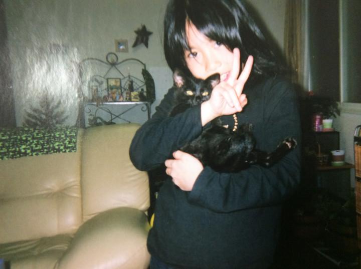 娘に抱っこされてるチャーミーは、多分、我が家に来た時だから………