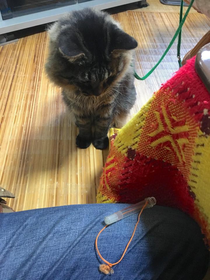 体温計ケースを発見した虎太郎が、ジーっと見ていました。