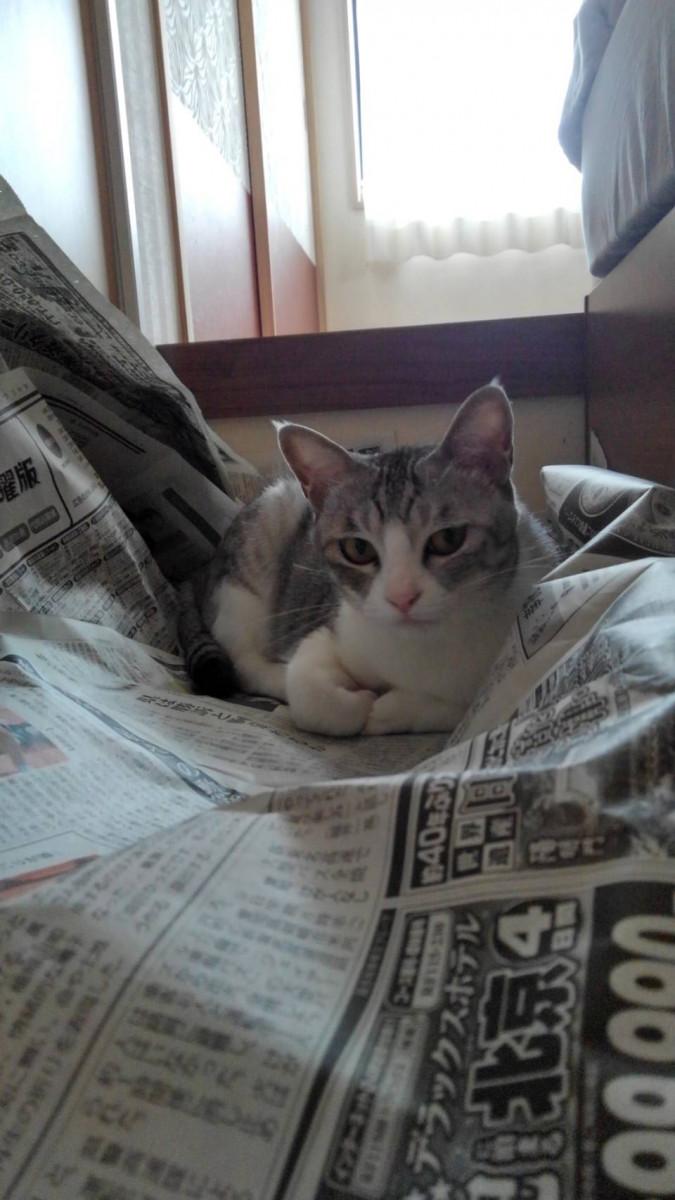 新聞紙、どうやったら、こんなふうに敷き詰められるんでしょうか?笑ねこって器用ですね。笑笑