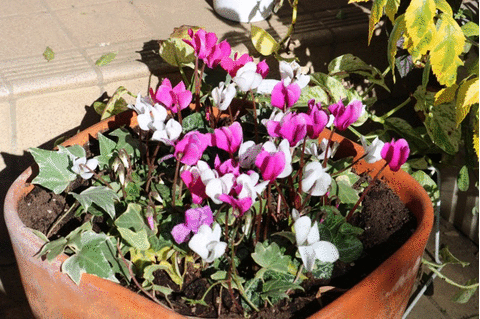ガーデンシクラメンを寄せ植えにした。鉢の大きさに対して、苗が少ないのでちょっと寂しいかな。