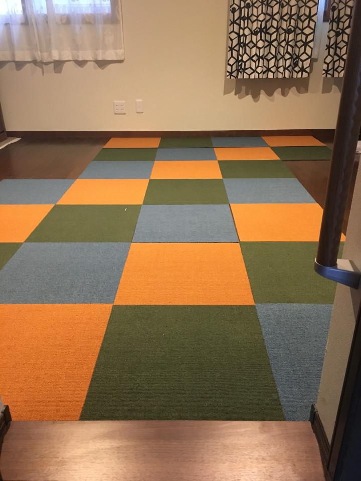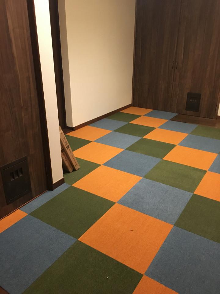 プレオープンの日にちを決め、猫の皆さん移動の前に、猫スペースの床にタイルカーペットを貼りました!