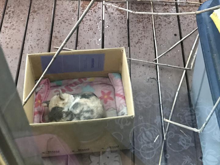 ↑我が家のウッドデッキにて、子ミケちゃんが寝泊りしてるダンボールがこれ。