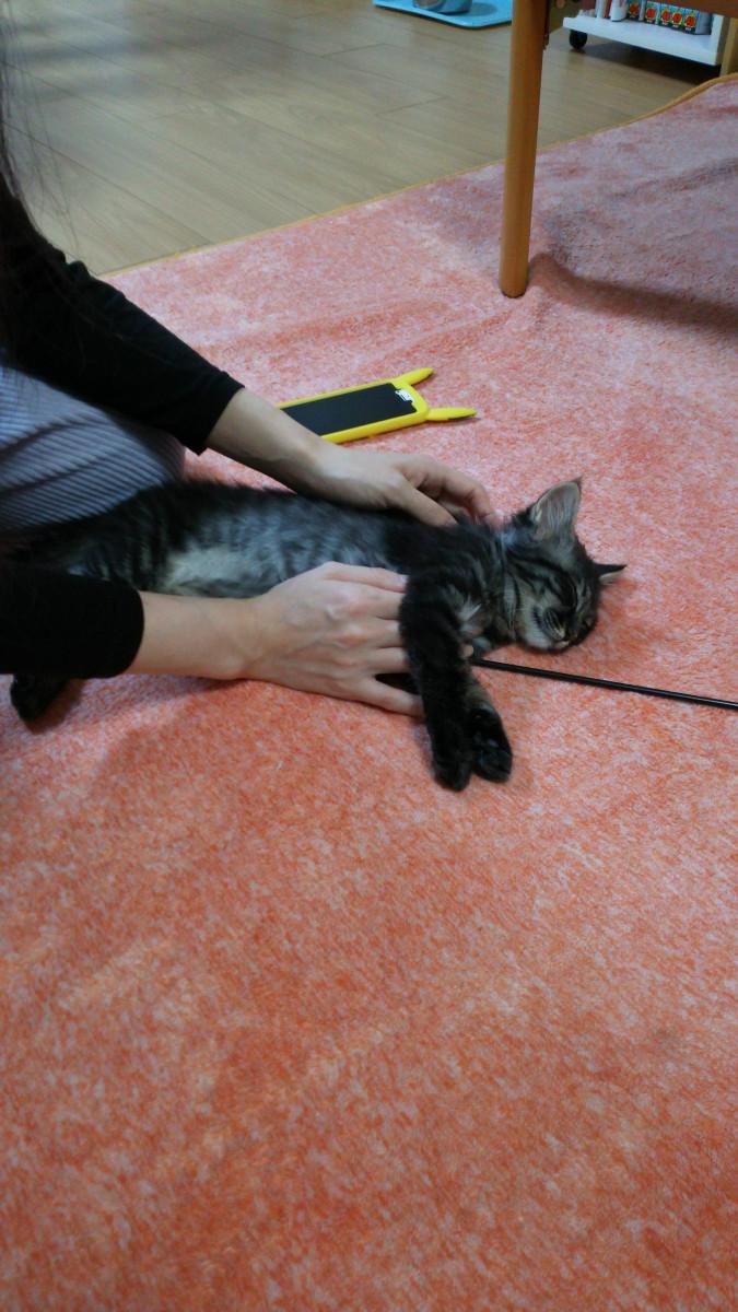 その後、私が猫じゃらしでちょびとモモと遊んで、彼女はレーザーポインターでふぅと遊んで貰いました\(^o^)/なんと彼女はふぅを撫でていました❗もちろんふぅはまだ緊張していますが(笑)