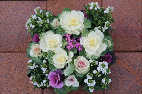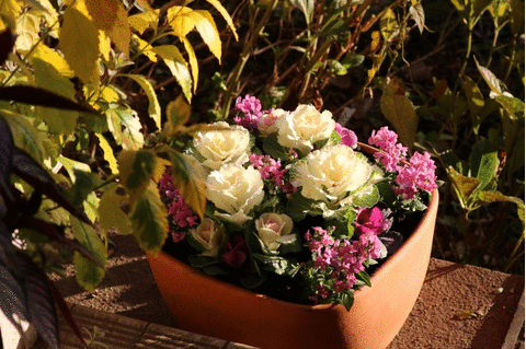 清楚なブーケのような白も捨てがたいけど、葉ボタンの白が引き立つピンクにしてみました。