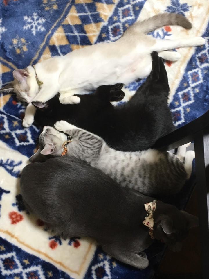 うちでも猫団子?ならぬ鍋に豚バラ敷き詰めたみたいな奇跡の4ショット(⑉• •⑉)‥♡笑っ