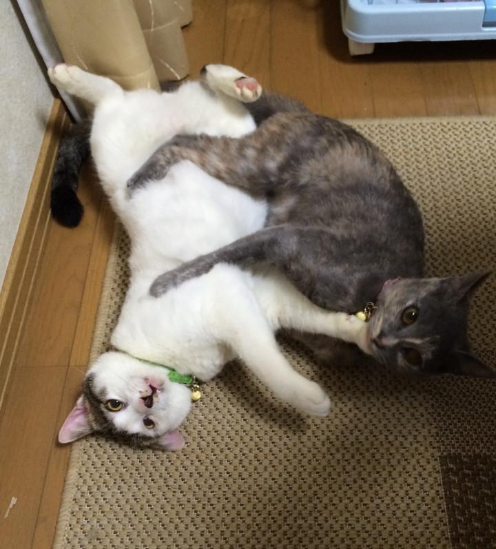 1ヶ月くらい経ったら、いやいやながらアゴを触らせてくれるようになりゴロゴロ。そのうち人間が居ても下に下りてくるようになり、シロと毎日運動会〜(^。^)