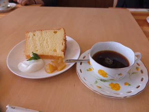 手作りのシフォンケーキ、コーヒー、畑で採れた里芋のゆでたてをお手製の味噌をつけていただきました。