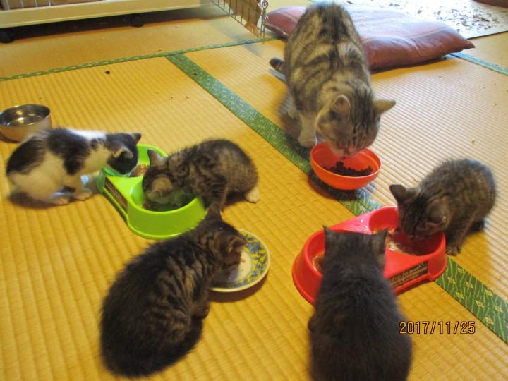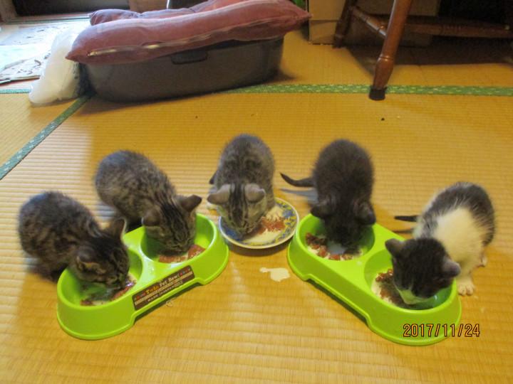 真ん中の子のお皿手前の白いのは突進されてこぼしたミルク