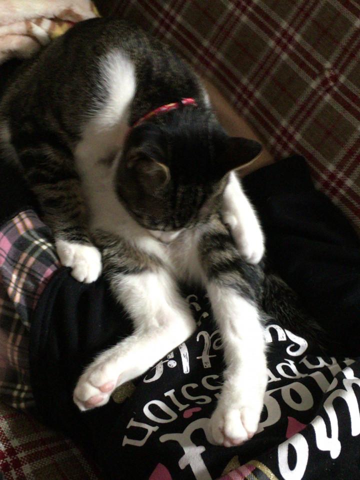 運動会のあと、娘のお腹の上で二つ折りになってたルイさん。